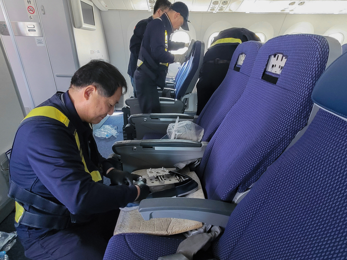 기내 인테리어 개선 작업은 기존 장착했던 회색 헤드레스트와 시트커버를 모두 탈착한 뒤 쿠션을 보강해 새로운 시트커버를 장착하는 순으로 이뤄졌다. 이후 정비 전문가들이 헤드레스트를 새제품으로 교체하면서 작업을 마무리 지었다. 남은 1대의 33인치 항공기는 6월말 개선 작업을 끝마칠 예정이다.