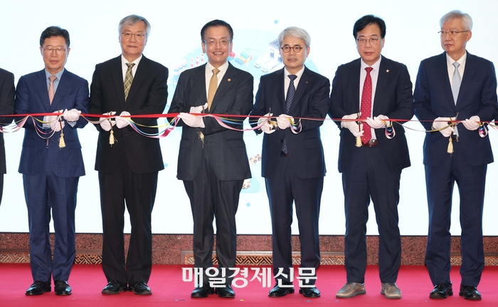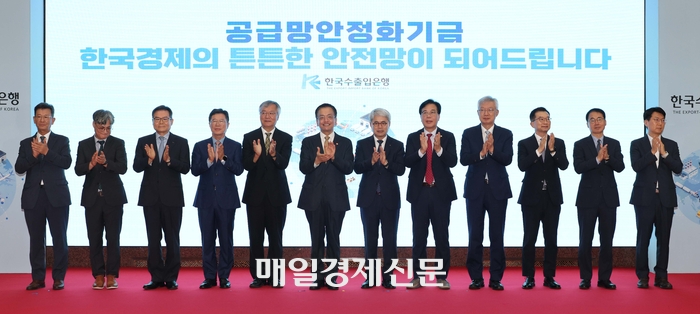 최상목 경제부총리 겸 기획재정부 장관과 윤희성 한국수출입은행장,송언석 국회 기획재정위원회 위원장을 비롯한 참석자들이 5일 서울 영등포구 여의도 한국수출입은행 본점에서 열린 공급망안정화기금 출범식에 참석해 테이프 커팅식을 하고 있다. 2024.9.5 [한주형기자]