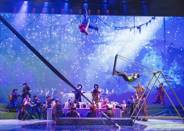 26일 기자들을 대상으로 진행된 시연 행사에서는 러시안 스윙·트래페즈·파이어 세 장면이 공개됐다. 러시안 스윙은 대형 시소 구조물에 탄 연기자가 공중으로 솟구쳐 오르는 종목으로,별이 쏟아지는 숲속 영상을 배경으로 기예와 무대미술이 한 화면 안에서 맞물렸다. 트래페즈 장면에서는 주인공 이엘 역 연기자가 폭포와 무지개 빛 영상 속에서 홀로 공중을 유영하는 구성으로 이어졌다. 파이어 퍼포먼스는 붉은 조명 아래 복수의 연기자가 불을 다루는 장면으로,세 종목 중 가장 강렬한 시각적 대비를 이뤘다. 서사와 음악,영상이 기예와 맞물려 진행되는 방식으로 단순 묘기 중심의 구성과는 결이 달랐다.