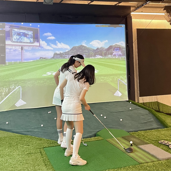 에어서울 고객이 지난 24일 강남구 학동로에 위치한 ‘넥스트크리에이티브’에서 박혜준 프로의 레슨을 받고 있다. [사진출처=에어서울] “아이언은 찍어서 드라이버와 우드는 쓸어친다는 느낌으로 쳐요. 머리를 고정하는 것도 중요합니다. 머리가 떨어지면서 치니까 방금처럼 공이 두껍게 맞는 건데…”