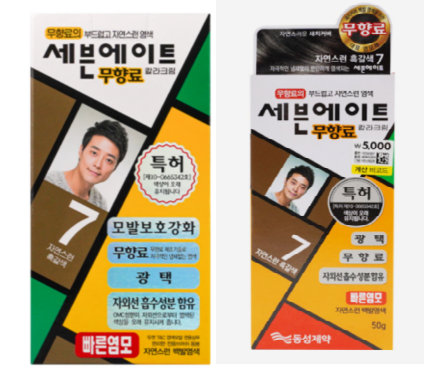 동성제약이 약국에 납품하는 세븐에이트(왼쪽)와 다이소에 출하하는 세븐에이트(오른쪽).[사진 제공 = 동성제약·다이소몰] 동성제약이 염색약 ‘세븐에이트’를 두고 약사들이 다이소와의 가격 차이를 문제 삼자 결국 다이소 유통 출하를 중단했다.