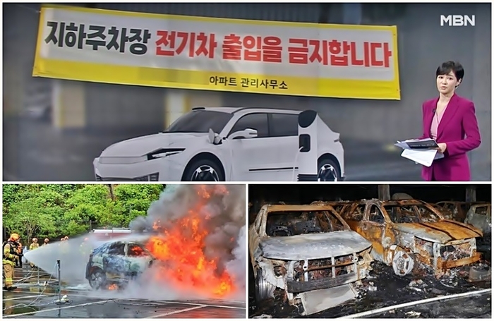 전기차 공포증 [사진출처=MBN 뉴스화면 캡처,서울시,연합뉴스] 메르세데스-벤츠 코리아가 인천의 한 아파트 지하주차장에서 발생한 벤츠 EQE 화재로 피해를 입은 주민들에게 45억원을 기부하겠다는 뜻을 밝혔다.
