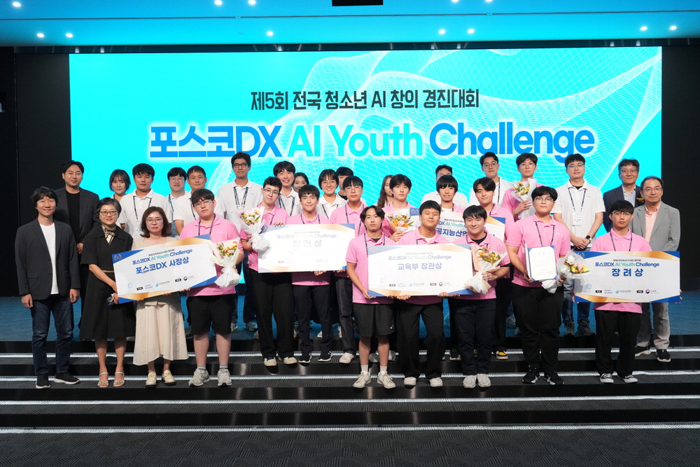 포스코DX가 지난 27일 경기 판교 사옥에서 중고생이 참여하는 인공지능(AI) 개발 역량 대회 '2024 AI 유스 챌린지(Youth Challenge)'를 진행했다고 28일 밝혔다. 올해로 5회를 맞이한 유스 챌린지는 전국 중고생이 '더 살기 좋은 사회,AI가 만드는 따뜻하고 밝은 세상'을 주제로 창의적인 아이디어와 AI 개발 역량을 선보이는 장이 됐다. 이번 대회는 포스코DX가 한국인공지능산업협회와 공동으로 주최했고,교육부가 후원했다. 사진은 수상자들이 모여 기념 촬영을 하고 있는 모습. 포스코DX