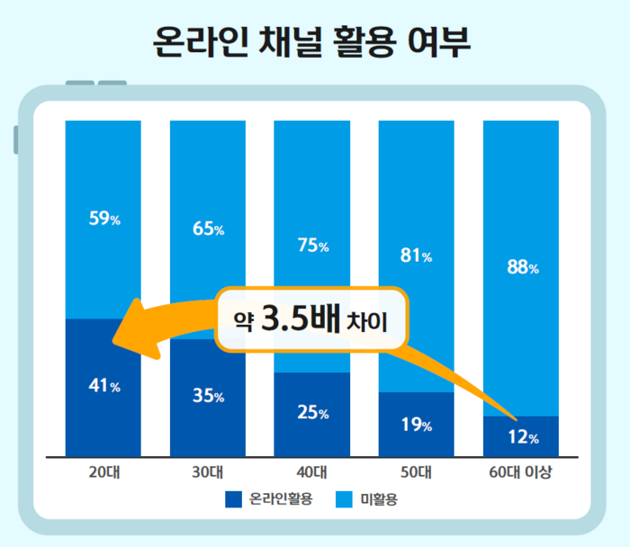 온라인 플랫폼을 활용하는 비율이 20대는 41.4%,30대는 35.2%로 나타난 데 반해 40대 25.0%,50대 18.6%,60대 이상은 12.2%로 나타나 20대의 활용도가 60대 이상 연령대 보다 약 3.5배 높은 수치를 보였다.