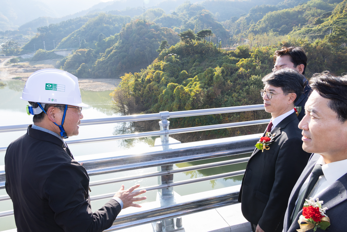 김완섭 환경부 장관(오른쪽 둘째)과 김진태 강원특별자치도지사(오른쪽 첫째)가 원주천댐 현장에서 관계자의 설명을 듣고 있다. [환경부] 환경부가 국내 첫 번째 지역건의 댐인 원주천댐 준공식을 열고 환경 피해를 최소화하면서 꼭 필요한 댐을 건설하겠다는 정책 기조를 재확인했다. 원주천댐은 원주천 유역의 홍수 피해를 예방하기 위해 지난 2012년 추진됐다. 2019년 착공 이후 약 5년 간의 공사 기간을 거쳐 올해 준공됐다.