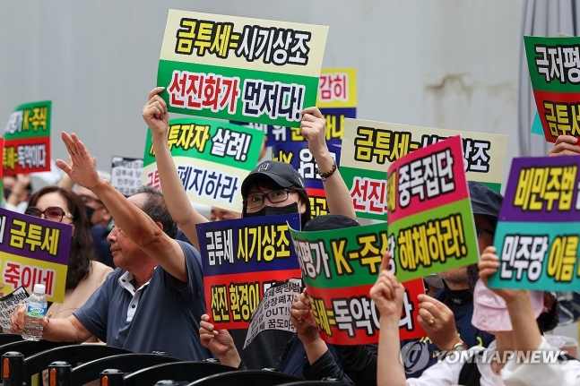 한국주식투자자연합회(한투연) 회원들이 지난 5월 서울 영등포구 더불어민주당 당사 앞에서 금융투자소득세(금투세) 폐지 촉구 집회를 열고 구호를 외치고 있다. [사진 = 연합뉴스] 더불어민주당 기획재정위원회 의원들이 내년 1월로 예정된 금융투자소득세 시행 시점을 3년 뒤인 차기 대선 이후로 미루는 방안을 국민의힘에 제시할 것으로 알려졌다. 그동안 시행 강행과 유예로 목소리가 나뉘어 당론을 결정하지 못했던 민주당이 유예로 가닥을 잡을 경우 이미 폐지 방침을 밝힌 야당과 논의가 속도를 낼 것으로 보인다.