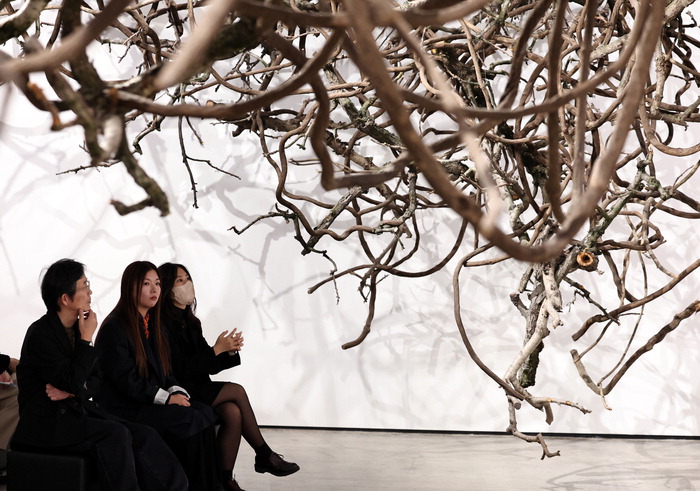 천장에서 거대한 나무 뿌리가 내려와 공간을 가득 메웠다. 지상의 1층 전시장이지만 마치 나무가 뿌리를 내린 땅 밑 지하 공간에 들어와 있는 듯하다. 보태니컬 아티스트 박소희가 식물을 가꾸는 과정에서 생장을 돕기 위해 잘라내 버려지는 나뭇가지들을 모아 제작한 설치 작품 'COMPLEX_root'(2024)다. 대개 위에서 아래로 내려보거나 땅 밑에 묻혀 볼 수 없는 대상인 나무 뿌리의 위치를 생경하게 역전시킨 이 작품은 지하 공간과 보이지 않는 존재들에 대해 상상하게 만든다.