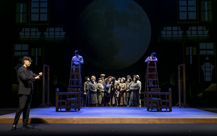 연극 ‘우리읍내’에서 서술자 역할을 하는 인물 ‘무대감독’이 관객에게 이야기를 전달하는 모습. 경기도극단 경기도극단의 이번 ‘우리읍내’ 공연의 특이점은 중년 이상의 인물로 묘사돼 온 ‘무대감독’을 30대의 청년 배우가 연기하는 것에 있다. ‘우리읍내’ 연구서들에서 와일더의 현신으로 해석되기도 하는 ‘무대감독’을 삶의 경험이 많은 노인이 아닌 젊은이로 바꿔 이야기를 전달하는 것이다.