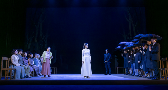 연극 ‘우리읍내’에서 죽은 자들(왼쪽)과 산 자들이 마을 묘지에서 마주 선 모습. 경기도극단