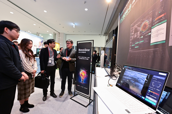 LG전자는 20일 서울 강서구 마곡 LG사이언스파크에서 B2B사업에 특화된 스타트업을 발굴·협업하는 ‘비즈노베이터 2024’의 성과발표회를 열었다. LG전자 관계자들이 초음파 영상을 인공지능(AI)으로 분석하는 ‘빔웍스’ 기술을 살펴보는 모습 <LG전자> LG전자가 전기차 충전이나 의료 분야의 스타트업과 협업해 B2B(기업 간 거래) 사업 경쟁력을 강화하고 새로운 성장동력을 발굴한다.