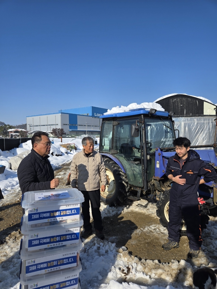 [사진 = 농협중앙회] 지준섭 농협중앙회 부회장(사진 왼쪽)은 29일 폭설(습설)로 인해 시설하우스 등 농업시설에 피해가 발생,경기도 용인시 피해현장을 방문해 농업인을 위로했다.