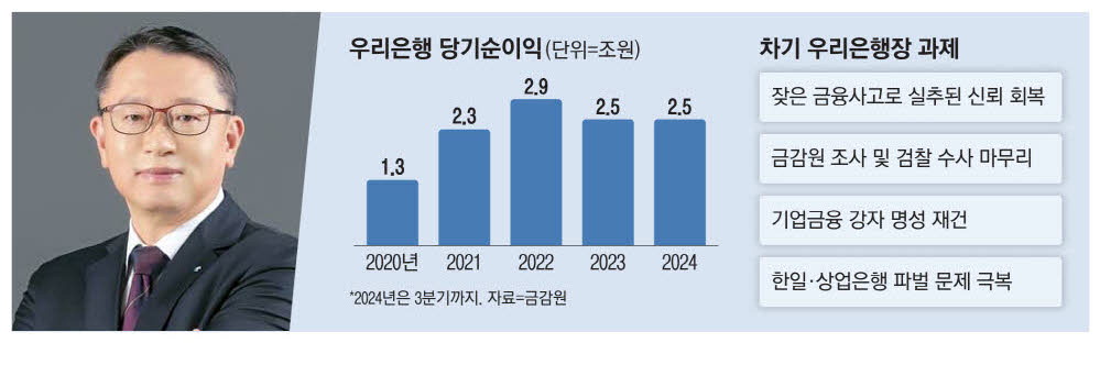 차기 우리은행장은 크게 네 가지의 과제를 해결해야 할 것으로 요구받는다. △잦은 금융사고로 실추된 신뢰 회복 △금융감독원 조사와 검찰 수사의 원만한 마무리 △기업금융 강자로서 명성 재건 △한일·상업은행 계파 갈등을 비롯한 파벌 문제 극복 등이다.
