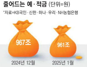 5일 KB국민·신한·하나·우리·NH농협 등 5대 시중은행에 따르면 1월 정기예금 잔액은 922조2998억원으로 전달 대비 4조4015억원이나 줄었다. 적금 잔액도 1조710억원 줄어든 38조7729억원을 기록했다. 예·적금에서만 5조5000억원 가까이 빠져나갔다.