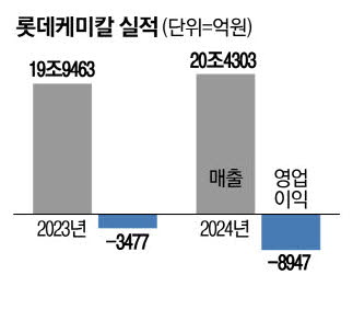 계열사를 포함한 연결기준 지난해 전체 롯데케미칼 매출액은 20조4304억원,영업손실은 8948억원,순손실은 1조8020억원을 기록했다. 영업손실의 경우 전년 대비 157.3% 늘었고 3년째 적자다.