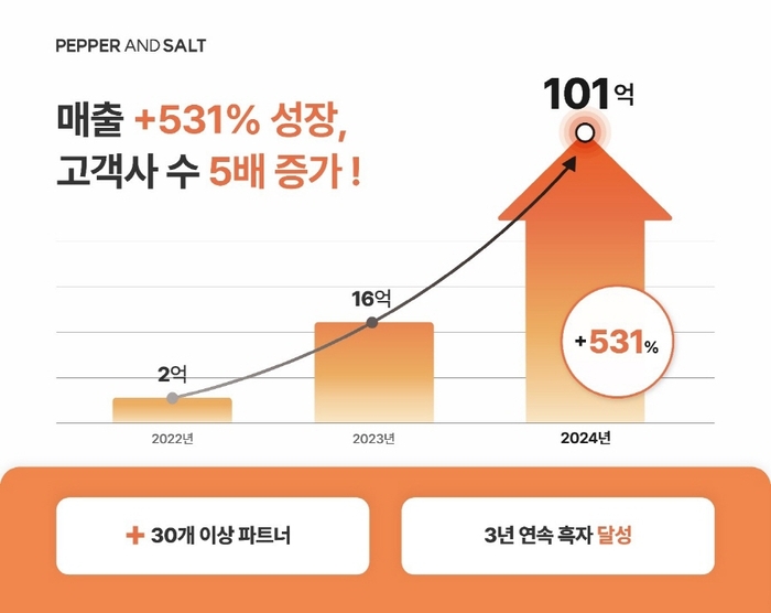 < 자료 출처 : 페퍼앤솔트 > K-콘텐츠 커머셜 라이징 전문 기업인 주식회사 페퍼앤솔트는 2024년 회계 마감 기준 연 매출 101억원을 기록하며,전년 대비 531% 성장해 5배 이상의 폭발적인 성장세를 보였다. 어려운 스타트업 환경 속에서도 창립 이후 무차입 경영을 유지하고 있으며,3년 연속 흑자를 기록하며 지속 가능한 성장 기반을 다지고 있다.