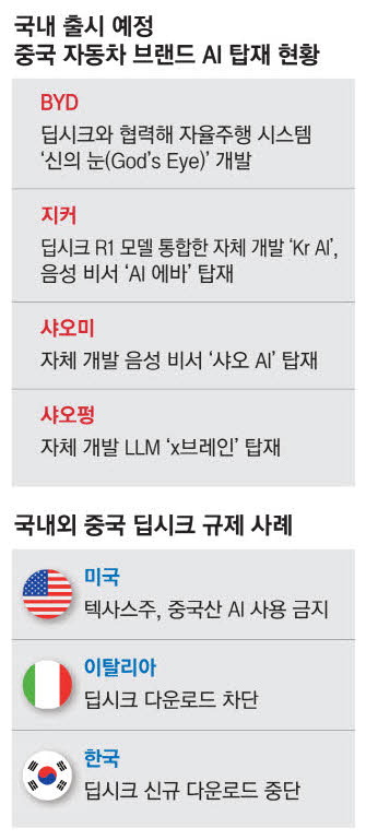 더 심각한 것은 한국에 진출을 타진하고 있거나 이미 진출한 중국 완성차 업체 5곳 중 3곳이 중국산 생성형 인공지능(AI) '딥시크'를 자사 AI 시스템과 통합하기 시작했다는 사실이다. 특히 왕촨푸 BYD 회장은 지난달 10일 중국 선전 본사에서 BYD 스마트 전략 발표회를 열고 향후 출시하는 모든 차량에 딥시크 기반 자율주행 시스템을 탑재하겠다고 밝힌 바 있다.