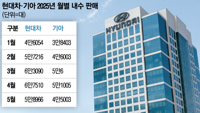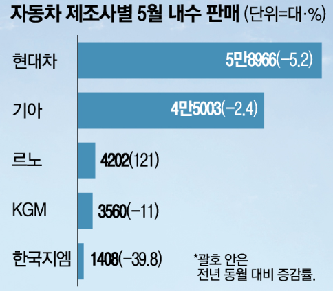 2일 국내 완성차 5개사가 발표한 ‘5월 내수 판매’ 자료에 따르면 현대자동차,기아,KGM,한국지엠 등 4곳의 내수 판매량이 지난해 5월에 비해 2.4~39.8% 하락한 것으로 나타났다. 르노코리아만 유일하게 지난해 하반기 출시한 그랑 콜레오스의 판매 호조로 전년 대비 개선된 5월 판매 실적을 발표했다.
