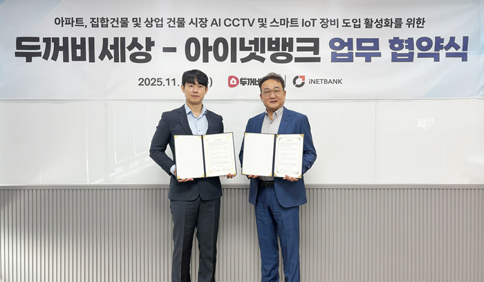 두꺼비세상은 11월 3일(월) ㈜아이넷뱅크(대표 장영)와 함께 ‘AI 물리보안 솔루션 버카다(Verkada)’ 독점 공급 및 사업 협력을 위한 전략적 업무 협약(MOU)을 체결했다고 밝혔다. 이번 협약으로 아이넷뱅크는 버카다 솔루션을 두꺼비세상에 독점 공급하며 양사는 이를 기반으로 국내 스마트 보안 생태계의 초격차 전략을 본격화할 계획이다.