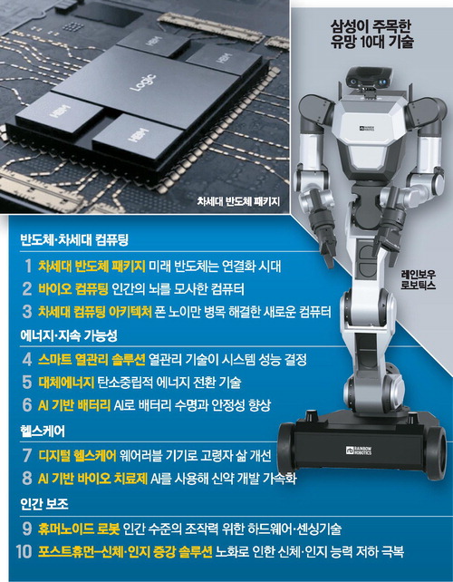 삼성이 앞으로 대한민국 미래 산업 경쟁력을 책임질 10대 유망 기술을 선정했다. 인공지능(AI) 산업 급부상으로 함께 떠오른 반도체부터 휴머노이드 로봇,인간 기대수명 130세의 '슈퍼 센티네리언 시대'에 대비하는 포스트휴먼까지 아우르는 10대 유망 기술을 두고 삼성과 각계 전문가들은 기술 추세와 향후 방향성에 대한 깊이 있는 논의를 이어갔다.