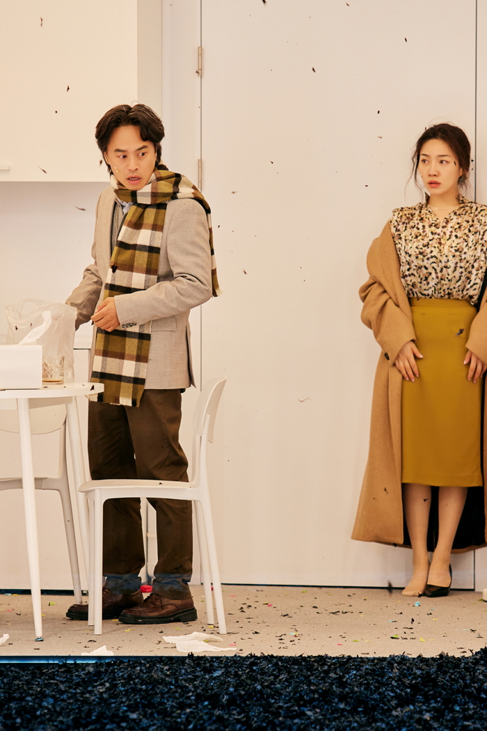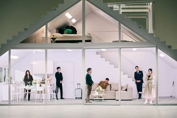 사이먼 스톤이 현대의 한국을 배경으로 재해석한 연극 ‘벚꽃동산’의 한 장면. LG아트센터 특히 그는 무대 위 배우들을 현실의 인물처럼 존재하게 하는 연출이 인상적이었다고 밝혔다. 스톤은 배우들이 공연 중 실제로 음식을 먹게 하고 무대 위 집 안에서는 진짜 집처럼 싱크대에 물을 틀 수 있게 했다. 대사를 할 때는 현실의 대화처럼 동시다발적으로 말하게 하기도 했다. 관객들이 대사를 구분하지 못할 것을 배우들이 우려하면 “지금은 내러티브가 아니라 인물 간의 역학과 에너지를 전달할 거야” “왁자지껄 떠들다 갑자기 조용해질 때 찾아오는 느낌을 의도할 거야”라고 설득했다. 손 배우는 “스톤은 배우들이 정말 그 인물로 존재하길 바랐던 것 같다”며 “관객의 반응조차 신경 쓰지 말고 인물에 집중하게 했고 그 과정이 아주 흥미로웠다”고 말했다.