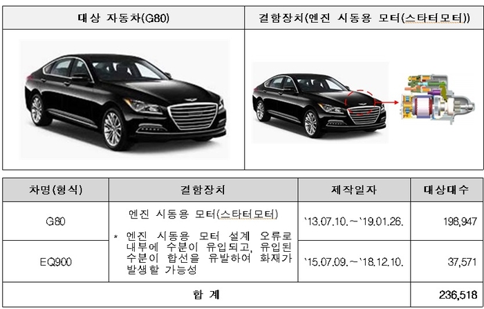 현대 제네시스 G80을 비릇한 2개 차종 23만6518대는 엔진 시동용 모터 설계 오류로,맥스크루즈 등 2개 차종 3만7169대는 전자제어유압장치(HECU) 내구성 부족으로 화재가 발생할 위험이 확인되면서 27일부터 시정조치에 들어간다.