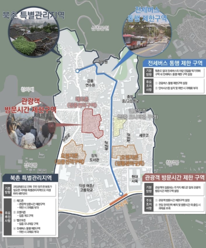 구는 대상지를 삼청동,가회동 일부를 포함한 북촌 지구단위계획구역(112만8372.7㎡)과 동일하게 설정했으며 주민 불편 수준에 따라 ▲레드존 ▲오렌지존 ▲옐로우존 ▲전세버스 통행 제한구역 등으로 나눴다.