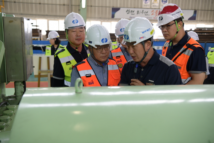 이승우 사장(앞쪽 왼쪽 첫 번째)이 발전설비를 점검하는 모습 [사진 = 한국남부발전] 이승우 한국남부발전 사장이 여름철 최대 전력수요가 경신됨에 따라 긴급 발전설비 현장점검을 시행했다.