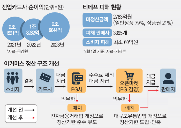 이커머스 시스템은 ‘소비자→카드사→ PG사→오픈마켓(티메프)→판매자’ 순서로 구매대금이 결제·정산돼 왔다. PG사는 이미 대금을 티메프에 입금한 후 돌려받지 못했지만,이번 사태 후 소비자에 선환불을 진행하고 있다. PG사는 향후 티메프에 구상권을 청구해 손실액을 배상받는 절차를 진행할 수 있지만 티메프의 상황을 고려하면 돈을 떼일 우려가 커졌다.