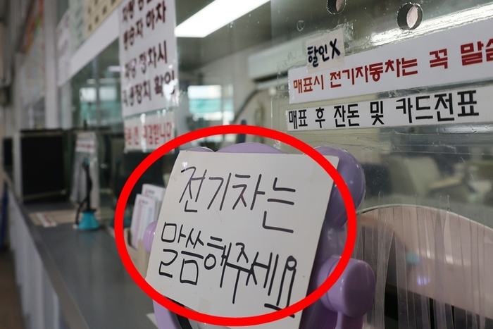 삼목선착장 매표소에 있는 전기차 안내문 [사진출처=연합뉴스] 배에 실린 전기차에서 불이 나면 대형 참사가 발생할 수 있다는 두려움에 일부 여객선사가 추석 연휴 전기차 충전율에 따라 승선을 제한하고 있다는 보도가 14일 나왔다.