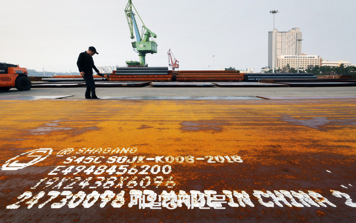 중국산 철강재 주요 수입로인 인천항에서 2일 한 물류 담당자가 ‘메이드 인 차이나(MADE IN CHINA)’라는 글귀가 적힌 중국산 후판을 살펴보고 있다. [이충우 기자] 중국산 철강의 덤핑(저가 밀어내기) 공세로 국내 철강업계의 어려움이 지속되자 정부가 중국산 철강에 대해 ‘잠정 덤핑방지 관세’를 추진한다.잠정 덤핑방지 관세는 반덤핑 조사가 시작된 후 최종 결론이 나기까지 시간이 오래 걸리는 만큼 국내 산업을 보호하기 위해 미리 임의부과하는 관세다. 통상 덤핑 제소부터 최종결론까지 1년 이상 걸리지만 잠정 덤핑방지 관세가 부과되면 그 기간을 절반 이상 줄일 수 있다. 관련기사 A5면2일 철강업계에 따르면 산업통상자원부 산하 무역위원회가 중국산 저가 후판(두께 6㎜ 이상의 두꺼운 강판)에 대해 잠정 반덤핑 관세를 부과하기 위한 검토에 착수했다. 무역위원회는 지난 7월 현대제철의 반덤핑 제소에 따라 지난 10월 4일 산업피해조사에 착수했으며,이르면 내년 1월 예비판정과 함께 기획재정부에 잠정 덤핑방지 관세 부과를 요청할 방침이다.세계 최대 철강 생산국이자 소비국인 중국은 내수부진으로 과잉생산된 철강을 소비하지 못하면서 저가 수출을 진행 중이다. 파이낸셜타임스(FT)는 중국 철강 자문업체 마이스틸 자료를 인용해 올해 중국 철강 수출량이 1억~1억100만t으로 2016년 이후 8년 만에 최대가 될 것이라고 보도했다.한국은 중국의 밀어내기 수출의 주요 타깃이다. 한국철강협회에 따르면 올 들어 10월까지 중국에서 수입된 후판은 115만7800t으로 지난해 전체 수입량 112만2774t을 넘어섰다. 2022년과 비교하면 80.5% 늘어났다. 가격은 국내산 대비 20%까지 저렴하다.인천내항에서 철강재 수출입을 담당하는 한 관계자는 “수입 철재가 압도적으로 싸게 들어오다 보니 국내 업체들도 수익성을 고려해 중국산을 사용하지 않을 수 없는 상황”이라고 전했다.이에 따라 현대제철과 동국제강이 공장 개보수 기간을 늘리는 방식으로 생산량 감축에 들어갔다. 포스코는 포항제철소 1제강공장과 1선재공장을 폐쇄했다. 현대제철도 제2공장 폐쇄를 추진 중이다. 한국철강협회에 따르면 올해 1~9월 누적 기준 국내 조강(쇳물) 생산량은 4764만t으로 최근 14년래 최저 수준을 기록했다.허윤 서강대 국제대학원 교수는 “미·중 무역갈등 와중에 중국이 미국에서 소화되지 않는 초과생산 물량을 한국과 같은 아시아 시장에 저가 공급할 가능성이 높다”면서 “그간 우리는 무역상대국과 마찰을 줄이기 위해 노력했는데,무역구제 측면에서 국내 산업 보호를 위한 전향적인 노력이 필요하다”고 지적했다.■ <용어 설명>▶
