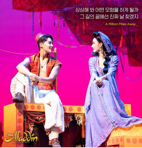 뮤지컬 알라딘은 오는 6월 22일까지 서울 송파구 잠실에 위치한 샤롯데에서 열린다. ‘알라딘’에는 김준수를 비롯해,서경수,박강현이 ‘자스민’은 최지혜를 비롯해 이성경,민경아가 ‘지니’는 정원형과 강홍석,정성화가 캐스팅됐다.
