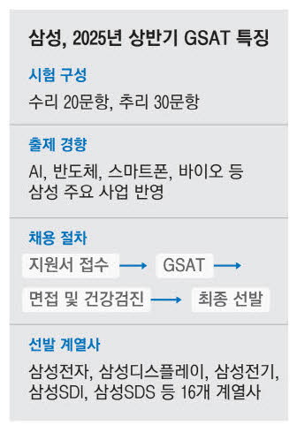 이번 GSAT는 삼성전자,삼성디스플레이,삼성전기,삼성SDI,삼성SDS,삼성바이오로직스,삼성바이오에피스,삼성물산,삼성중공업,삼성E&A,삼성생명,삼성화재,삼성증권,제일기획,에스원,삼성웰스토리 등 16개 계열사가 동시에 진행했다. 삼성은 올 3월부터 상반기 공채 절차를 시작한 상태다. GSAT를 통과한 인원을 상대로 면접과 건강검진을 거쳐 최종 선발하는 방식이다.
