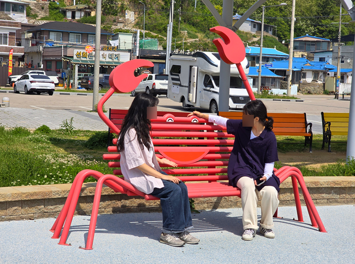 영덕 해파랑 공원 대게 벤치에 앉아있는 여행객들 / 사진=김혜성 여행+ 기자 지난 3월,경상북도 지역에 거대한 화마가 덮쳤다. 영덕군 역시 특별재난지역으로 지정됐을 정도로 피해가 심각했다. 영덕의 산도 타고 논도 타고 과수원도 타고 집도 탔다. 속옷부터 동전까지 싹 다 타버렸다.
