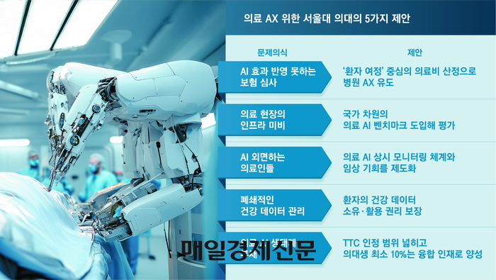 이규언 서울대병원 외과 교수와 수술로봇 ‘다빈치’가 손가락을 맞대고 있다. [이승환 기자] 병의원별 AI 도입 수준을 평가하고 이에 상응한 보상을 제공하는 방안이 있다. 단순히 AI 도입 여부만을 따지는 것이 아니라 운영 역량,부작용 감시,활용 성과,암호화 수준 등을 항목별로 평가하는 체계를 도입하는 것이다. 서울의대는 “객관적인 벤치마크와 정당한 보상이 주어진다면 병의원이 자연스레 AX에 나설 수 있다”며 “의료 AX 수준을 항목별로 지표화한다면 병의원마다 어느 분야에 투자할지 비교적 명확하게 판단하게 될 것”이라고 했다.“안전한 AI 사용 위해 임상 참여 기회 보장하고 상시 모니터링해야”AI를 직접 활용할 의료인에게도 명확한 가이드라인이 필요하다. 의료인이 AI 도입을 망설이는 가장 큰 이유는 법적 책임 소재와 기술 안전성에 대한 불안감이다. 서울의대는 “의료인의 적극적인 참여 없이는 의료 AX가 이뤄질 수 없다”며 “참여를 유도하기 위해선 정부가 제도적 기반을 만들어줘야 한다”고 했다.