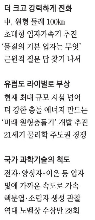 중국 공상과학(SF) 소설 '삼체'에서 외계인들이 지구 과학기술 발전의 근간으로 지목한 입자가속기는 국가 기초과학 경쟁력을 좌우하는 실험장치다. 28개의 노벨물리학·화학상 수상연구가 모두 입자가속기를 활용해 내놓은 성과일 정도다. 중국은 세계 최대 입자가속기를 건설해 '힉스 입자'에 대한 이해를 넓힐 계획이다. '신의 입자'라는 별칭이 붙은 힉스 입자는 우주 탄생의 원리를 설명하기 위한 가설 중 가장 유력한 표준 모형에서 없어서는 안 될 소립자다. 아직까지 인류는 힉스 입자에 대한 이해가 부족하다. 이 때문에 중국의 입자가속기 구축 소식은 중국이 인류의 지식을 확장하는 데 선두에 나설 수 있다는 점을 시사한다.