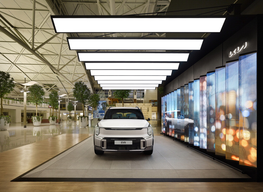 기아가 인천국제공항 제1여객터미널 3층 출국장에서 운영 중이던 기아 차량 전시 부스를 '기아 체험형 전시 부스'로 새단장했다고 2일 밝혔다. 방문객들은 전시 차량에 직접 탑승해볼 수 있다. 부스는 서아키텍스건축사사무소가 거울과 LED 스크린이 결합된 '더블 스킨' 구조를 채택해 설계했다. 사진은 전시 부스에 기아의 플래그십 스포츠유틸리티차량(SUV) 'EV9'이 전시된 모습. 기아