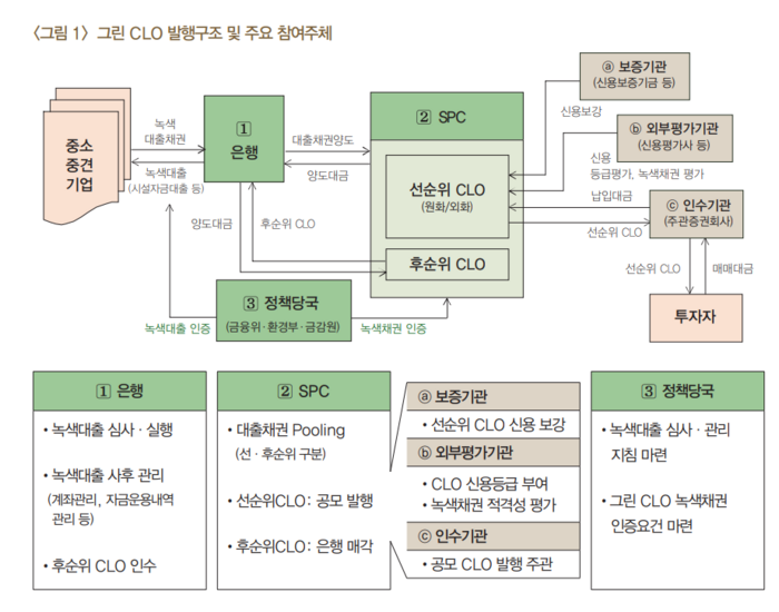 그린 CLO 발행구조와 주요 참여주체 <자료=한국은행> 녹색 대출 담보부 유동화증권(그린 CLO)이 도입되면 중소기업의 친환경 전환용 자금조달 수단으로 유용하게 쓰일 수 있으며 좀 더 낮은 수준의 조달금리를 기대할 수 있다는 전망이 나왔다.