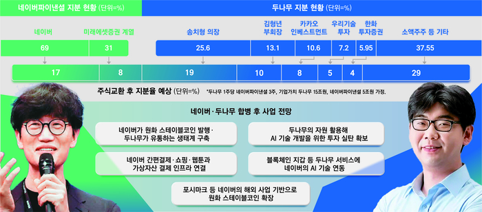 28일 관련 업계에 따르면 현재 추진되는 네이버파이낸셜과 두나무의 결합은 각 분야(인터넷 플랫폼과 가상자산 거래소)의 국내 1위 주자들이 미래 성장을 도모하겠다는 두 수장(이해진 네이버 창업자 겸 이사회 의장·송치형 두나무 이사회 의장)의 강력한 의지가 작용한 결과다.