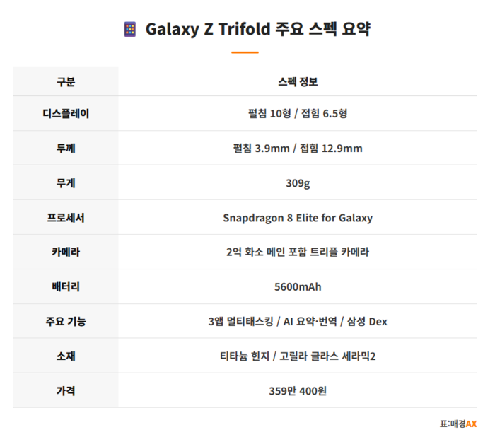 갤럭시 Z 트라이폴드는 국내에서 359만400원에 출시되었으며,삼성닷컴과 전국 20개 매장에서 판매 중입니다. 글로벌 시장에도 순차적으로 출시되고 있습니다.