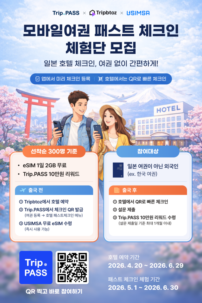 ‘모바일여권 패스트체크인 체험단’ 모집 포스터 [로드시스템] 관광 금융 플랫폼 트립패스(TripPASS)를 운영하는 로드시스템(대표 장양호)은 일본 주요 호텔에서 체크인을 여권 대신 QR(정보무늬) 코드로 하는 ‘모바일여권 패스트체크인’ 서비스를 본격 시행한다고 28일 밝혔다.
