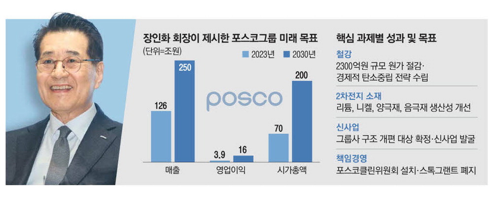 '100일간의 현장경영'을 마친 장인화 포스코그룹 회장이 2030년까지 포스코그룹의 시가총액을 현재의 3배에 이르는 200조원 규모로 확대하겠다며 미래 경영 비전을 밝혔다. 이를 위해 포스코그룹은 기존 철강,상사,건설 부문에 쏠려 있던 사업 포트폴리오를 2차전지 소재와 우주·모빌리티·탄소 저감 등 신소재 분야로 넓혀 수익 구조를 다변화하기로 했다.