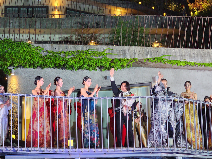 지난 1일 경기 이천시 라드라비 리조트 야외무대에서 열린 앙드레김 추모 패션쇼에서 김중도 앙드레김 아뜰리에 대표(오른쪽에서 세번째)가 인사를 하고 있다. [사진=김금이 기자] “앙드레김 선생님이 다시 바람이 돼 오셨습니다. 지난 14년간 아버지의 삶을 이어온 아들 김중도 대표가 도약의 발판을 만들고자 합니다.” (김재원 아나운서)