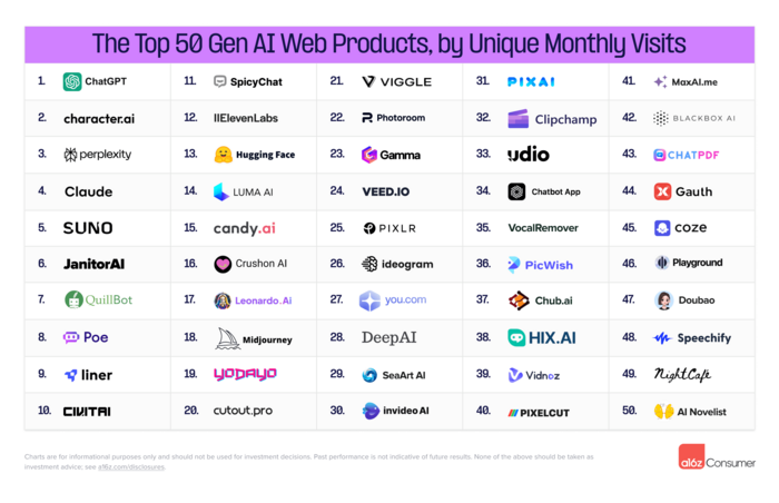 이번 조사는 2024년 7월 데이터를 기준으로 했으며,a16z는 웹 서비스 상위 50개와 모바일 앱 서비스 상위 50개로 나누어 발표했다.