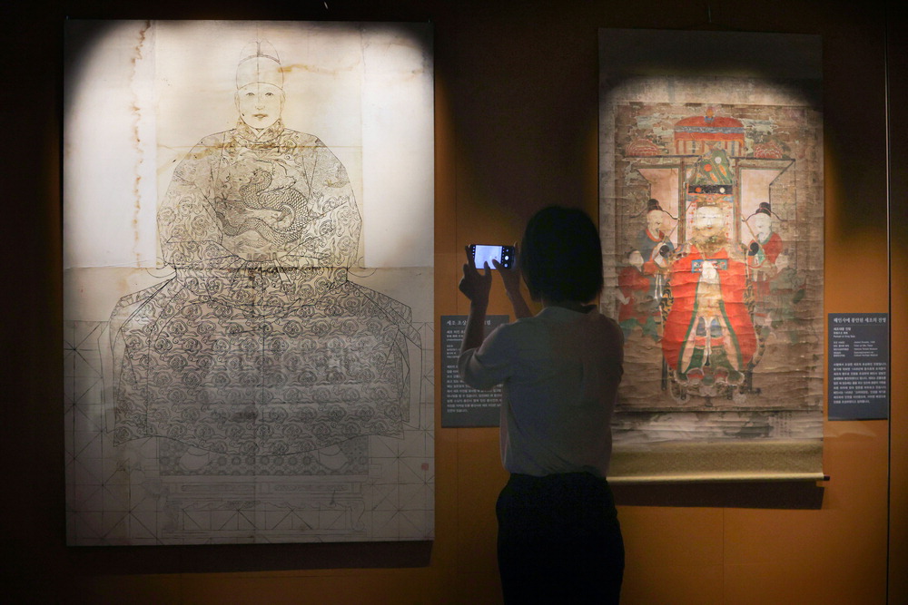 4일 종로구 불교중앙박물관에서 열린 특별전 '큰 법 풀어 바다 이루고,교종본찰 봉선사' 언론 공개회에서 참석자가 '세조 어진 초본'(왼쪽)과 '세조대왕 진영'을 둘러보고 있다. 연합뉴스
