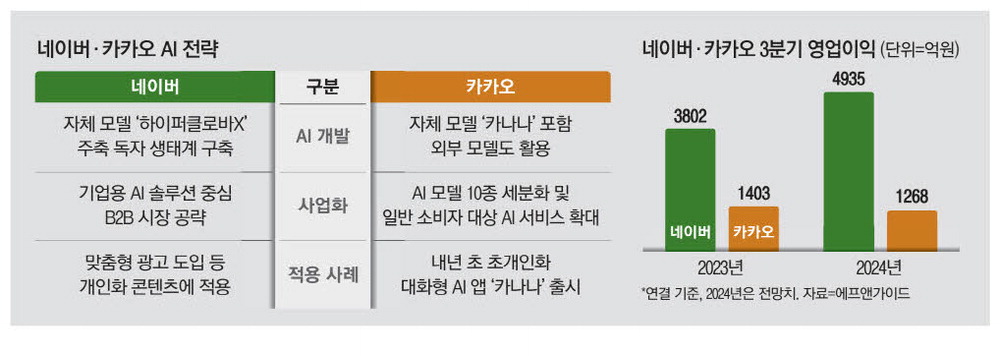 반면 카카오는 콘텐츠 사업의 부진이 뼈아프게 작용할 전망이다. 특히 핵심 캐시카우 역할을 하는 기존 사업 부문의 성장성이 꺾인 상황에서 새로운 모멘텀으로 작동할 수 있는 AI 사업이 좀처럼 속도를 내지 못한 것이 또 다른 악재가 됐다는 분석이다.