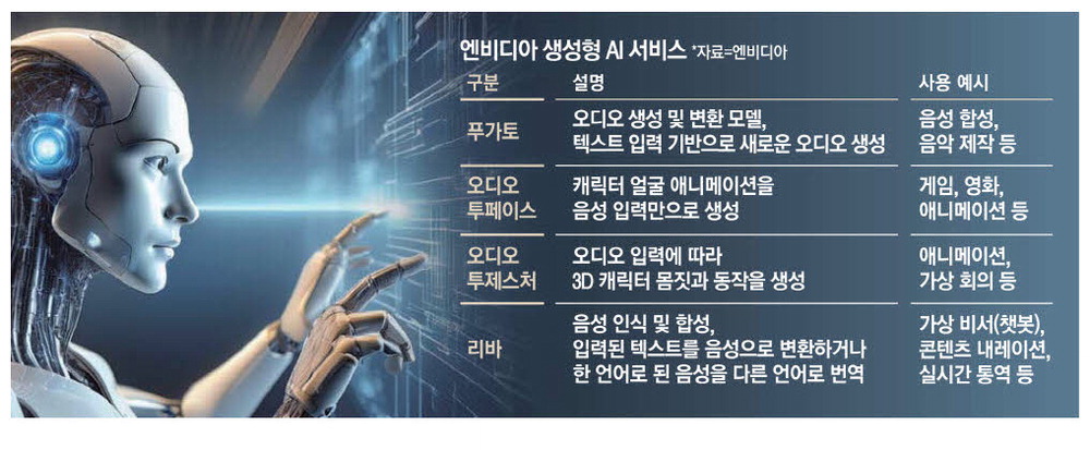 엔비디아의 AI 음악·오디오 새 모델이 기존 기술과 다른 점은 피아노로 연주된 선율을 사람의 노랫소리로 전환하거나 녹음된 음성의 악센트나 말투,분위기를 바꿀 수 있는 것이라고 로이터는 전했다.
