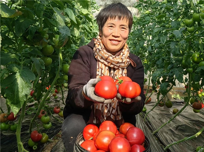 황금빛으로 기득한 가을 때 쥐남군 석연밥읍 두자팅 강촌의 협동조합은 기쁨에 넘쳤고, 붉은 토마토가 가지에 가득 걸려 있어 마치 작은 빨간 등불 같다.