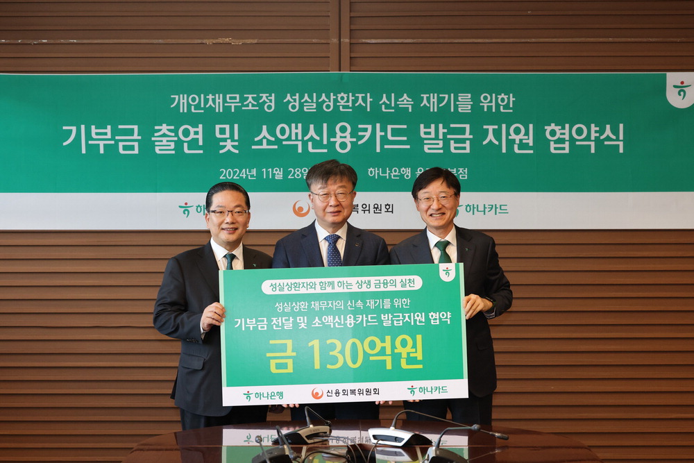 28일 '개인채무조정 성실상환자 신속 재기를 위한 소액 신용카드 발급 지원 협약식'에서 이호성 하나카드 대표,이재연 신용회복위원회 위원장,이승열 하나은행장(왼쪽부터)이 기념촬영을 하고 있다. 하나은행이 신복위에 130억원을 기부한 자금을 기반으로 성실상환자 6만5000명에게 100만원 한도의 신용카드가 발급된다. 신용회복위원회