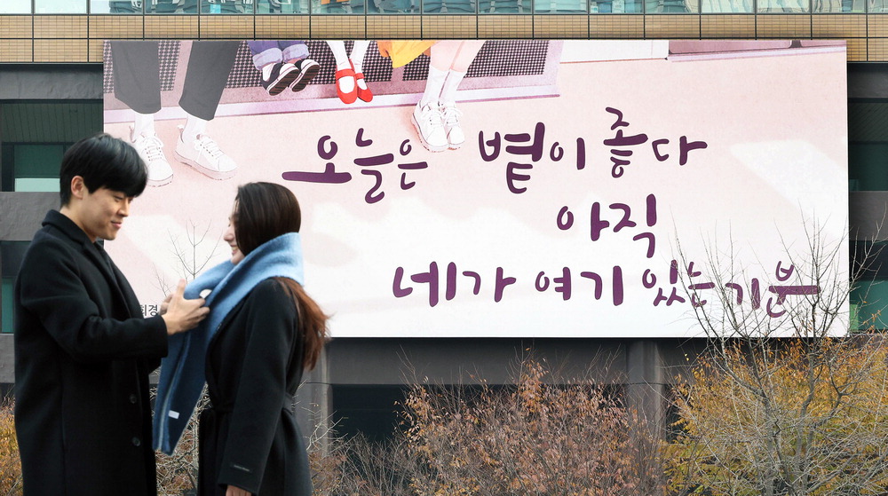 겨울을 맞아 새로 단장한 광화문글판이 2일 서울 교보생명빌딩에 걸려 있다. 이번 글판에 적힌 문구는 유희경 시인의 시 '대화'의 일부분이다. 유 시인은 극작가와 시인으로 활동하고 있으며,2019년에는 제65회 현대문학상을 받았다. 이충우 기자