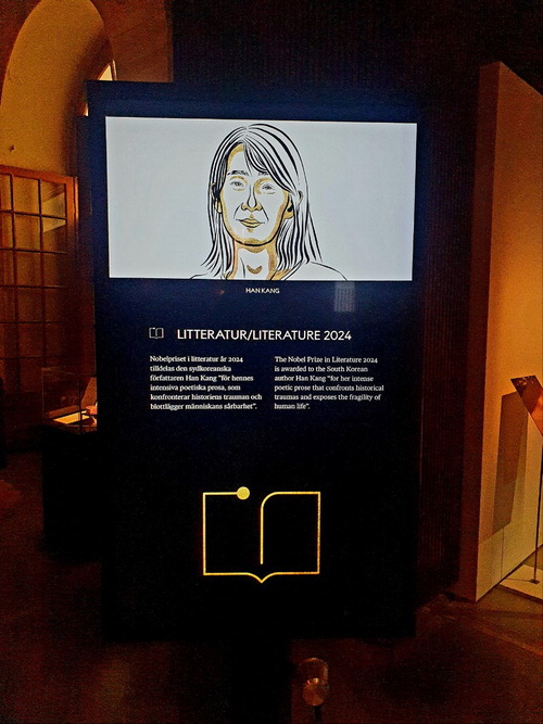 노벨상 박물관 로비에 전시된 '2024년 노벨문학상 수상 작가 한강'의 안내판.